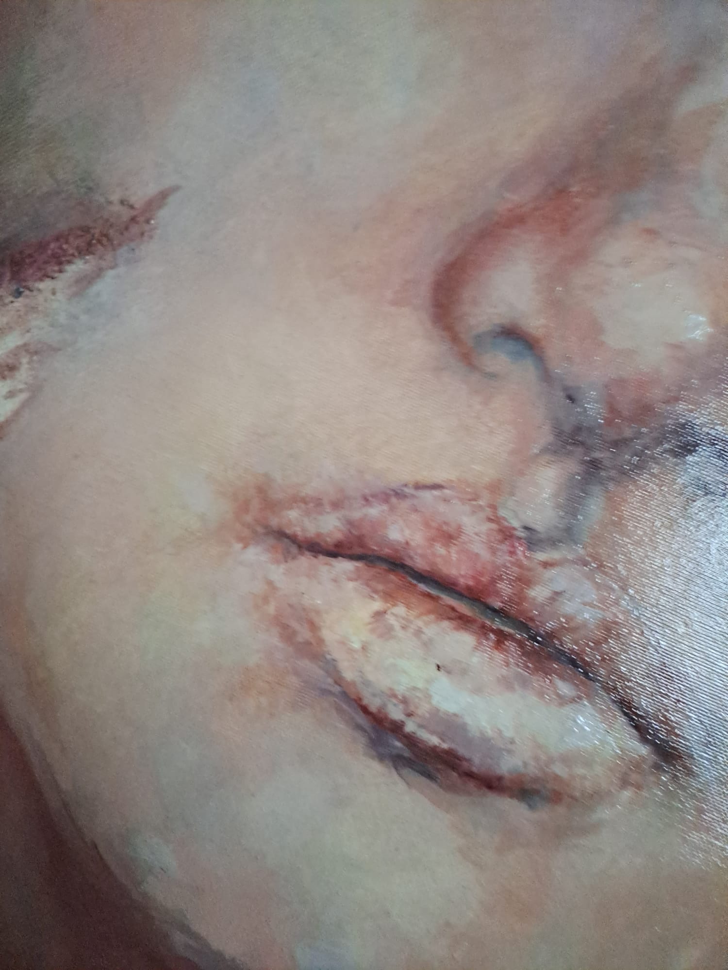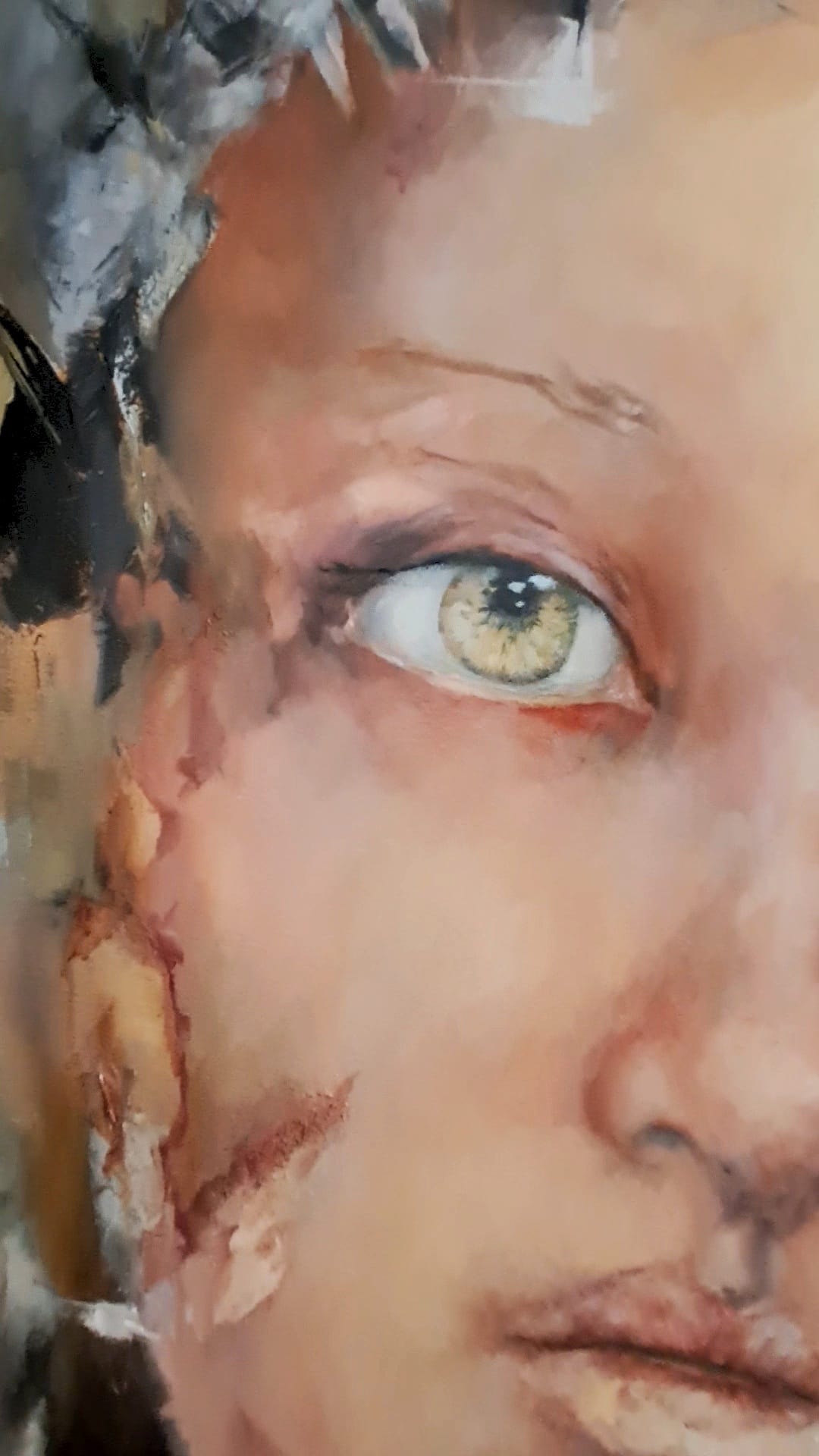Un volto immobile, eppure attraversato da silenzi profondi. Lo sguardo, limpido e distante, si fa specchio di un pensiero che si rifugia altrove, in uno spazio senza tempo. La materia pittorica, sospesa tra definizione e dissolvenza, accompagna questa fuga interiore, trasformando l’istante in eternità.uno sguardo in Sospeso, quell'attimo in cui ci si perde, nel niente, nel tempo ed altrove,nella propria emozione